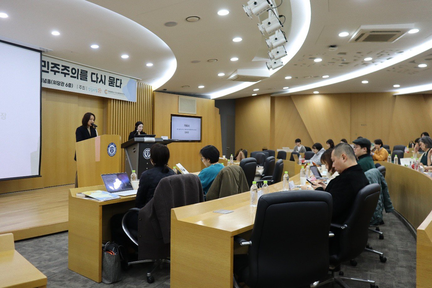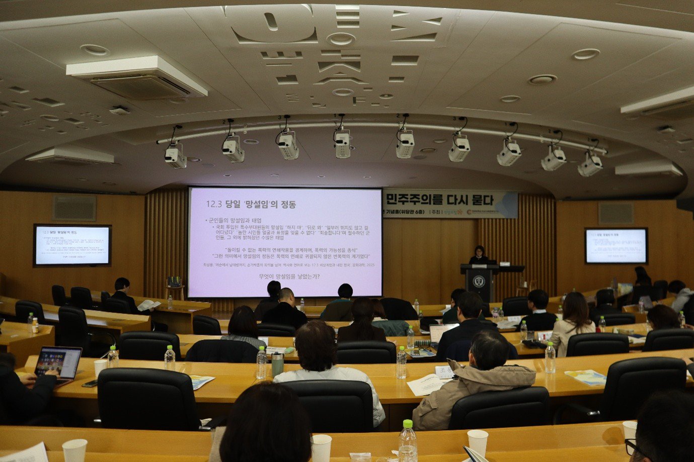 한 해를 마감하는 12월의 토요일은 약속이 없어도 마음이 무척 분주하기 마련이죠. 연말의 토요일 오후 5시간의 공부모임에 누가 오실까? 주최 측의 염려는 기우였습니다. 위당관은 꽉 찼습니다. “계엄 이후, 민주주의”를 고민하는 시민들의 열기가 뜨거웠습니다. 진실의 힘이 채집한 탄핵집회의 시민 자유발언(2024년 12월 3일 계엄선포 이후 2025년 4월 5일까지 진행된 총 190개 집회의 발언 1,334건)을 토대로 임유경 진실의 힘 이사(연세대 국문과 부교수)가 주도한 연구팀이 2025년 12월 6일, 80여명의 시민이 참석한 가운데 드디어 연구 내용을 선보였답니다.