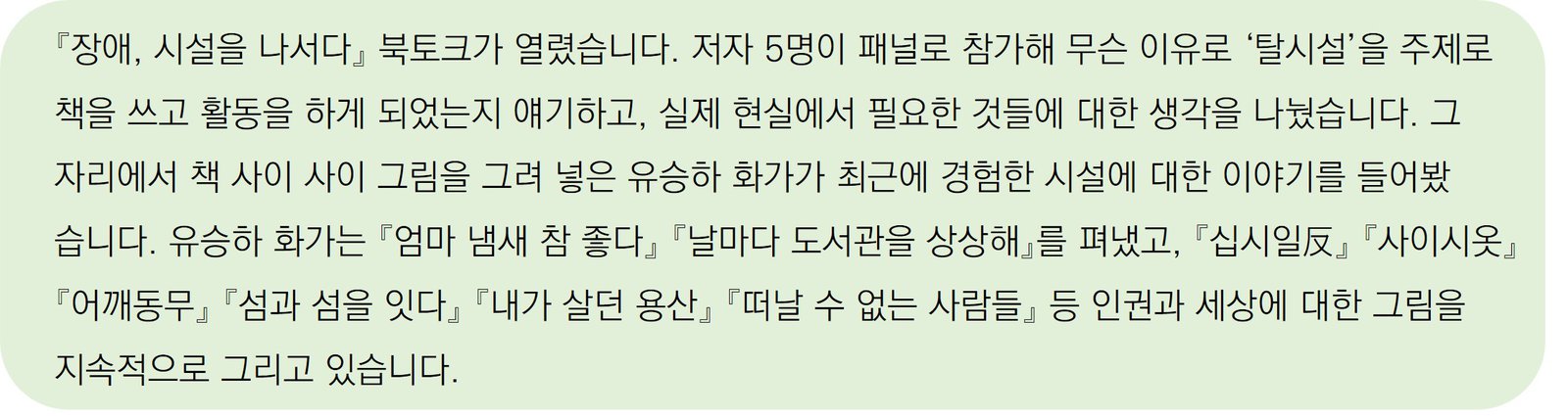 저희 어머니가 2년을 살 수 있겠다는 선고를 받고 8년을 사시면서 가족들은 존엄사를 고민 했었습니다. 이 책의 작업을 맡을 무렵 제가 몸이 안 좋아 지면서 결국 요양병원에 모시게 됐어요. 가장 좋은 시설이라고 해서 선택했는데 겉보기에는 보호자에게 잘하고 좋은 것 같았는데 어머니께서 돌아가실 무렵이 됐을 때 뭐랄까 폐기처분을 당하는 느낌이 들었습니다. 그나마 좋은 시설이란 말을 듣고 골라서 찾아간 병원이고 간병인에게도 잘했는데 어머니의 생을 마무리 하는 무렵에 들었던 말들, 당했던 일들, 상처들을 생각하면…… 그 큰 요양병원에 임종실이 하나 없이 빨리 좀 치워 달라고 하는 느낌을 받게 만드는 것 때문에 서러워서 많이 울었습니다. 어머니의 귀중한 마지막을 위해 공부를 한다고 했는데 당장 오늘, 막상 내 일이 되고 나니 ‘나는 하나도 준비가 되지 않았구나’ 하는 생각이 들었습니다. 탈시설을 하려면 시간이 걸릴 텐데 그 사이 드는 서러운 마음들은 어떻게 하나 싶습니다. 어쩌다 보니 인권에 관한 그림을 많이 그리게 됐는데 저는 이 책을 공부하듯이 읽었고 아직도 질문이 많습니다. 사는게 늘 질문의 연속인 것 같아요. 아파도, 장애가 있어도, 사람으로 대접받기를 바라고요. 덕분에 좋은 자리에 와서 많이 배워갑니다.