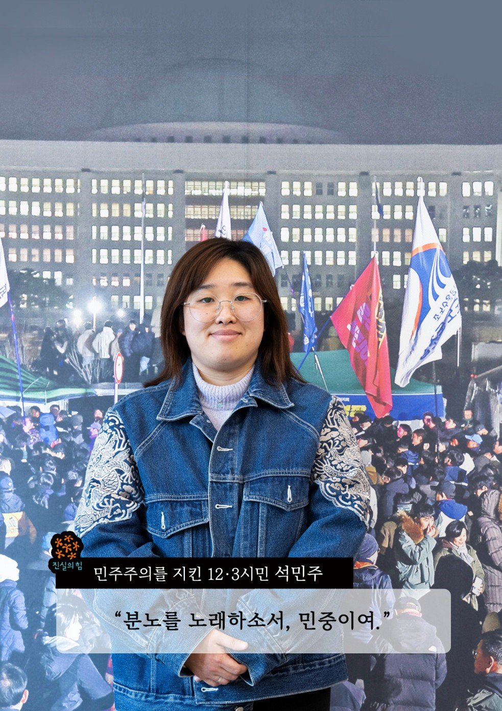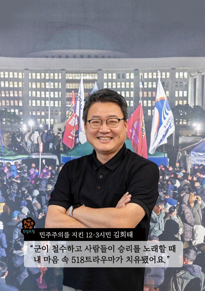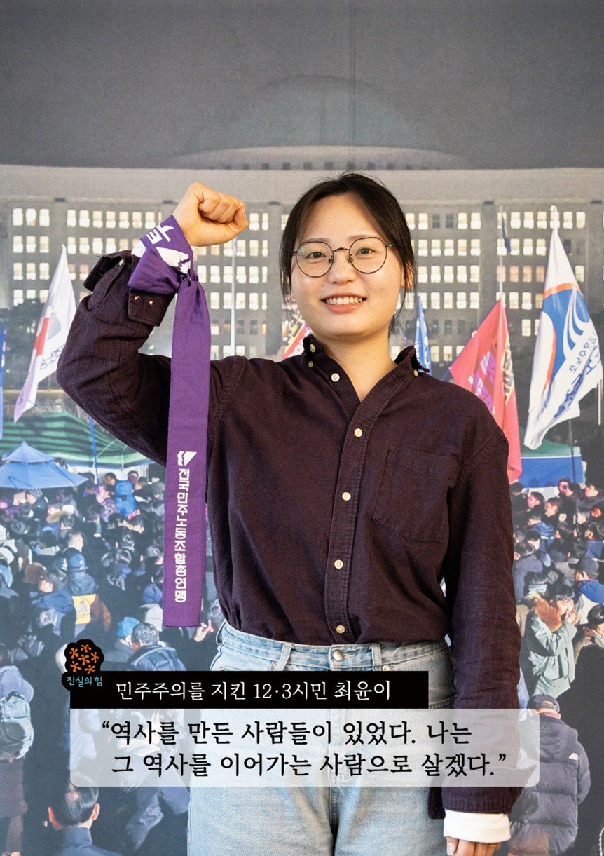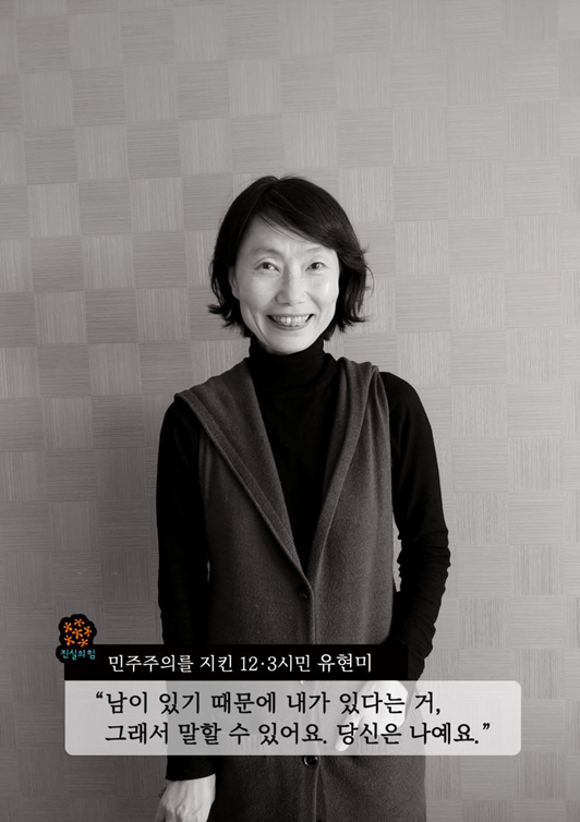 진실의 힘을 믿고 삶의 이야기를 들려준 12·3시민들의 인터뷰 모습을 사진에 담았습니다. 국회를 배경으로 한 포스터 앞에서 그날의 기억을 떠올리는 장면, 그날 밤의 생생한 기억을 떨리는 목소리로 전달하던 장면, 기쁘고 슬펐던 삶의 이야기를 들려주던 장면이 사진으로 남았습니다.